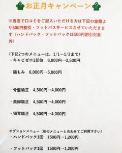 キャンペーンの告知をしていなかったのですが、1月は、1/1~1/3までキャビゼロと腸もみがかなりお得になっています😊