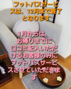 1月からは、お帰りまでに口コミ記入いただけるお客様のみフットバスサービスとさせていただきます💕