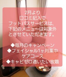 2月よりお知らせなのですが、口コミ記入でフットバスサービスは、下記のメニューは対象外とさせていただきますので、ご了承下さいませ🙇