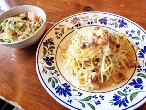 エビ、ベーコンは2種類、卵の薄焼きが乗っていたりと今まで食べたことのないカルボナーラでしたが、すごく美味しかったです❤