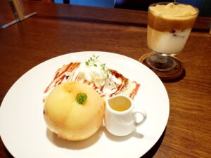 桃のパンケーキとダルダナコーヒーを注文しました💕