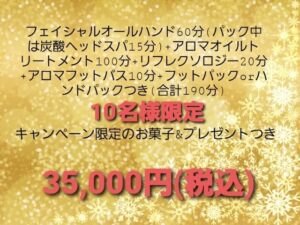【メニュー内容】 フェイシャルオールハンド60分(パック中に炭酸ヘッドスパ15分)+アロマオイルトリートメント100分+リフレクソロジー20分+アロマフットバス10分+フットパックorハンドパックつき 合計190分 35,000円(税込)