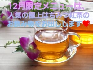 お知らせするのを忘れていましたが、先月お出ししていた【極上はちみつ紅茶】がかなり人気だったため、お取り寄せして12月限定キャンペーンメニューだけ、お菓子と一緒にお出しすることにしました❤