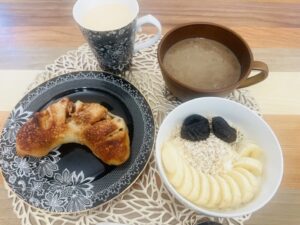 ソーセージのパン、マサラチャイ、オーガニックのマッシュルームスープ、ヨーグルトにバナナ、プルーン、オートミールです❤