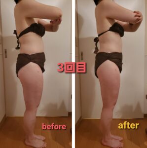 ◆右太ももつけね59センチ→59.4センチ(+0.4センチ) ◆ふくらはぎ37センチ→35.3センチ(-1.7センチ)