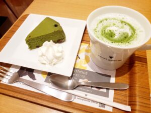 抹茶チーズケーキと抹茶グリーンティーを🍴✨