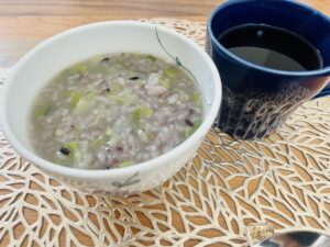 ここ病院じゃないけどなぁと思いつつ、細かくお野菜を刻んで消化にいい雑炊をお米が柔らかくなるまでコトコト煮込んだので噛まなくても食べれる✨