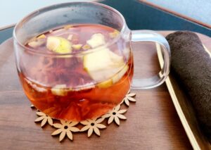 いちご、りんご、ベリー、ぶどうなどが入っていてフルーツの優しい甘さのお茶になります😋