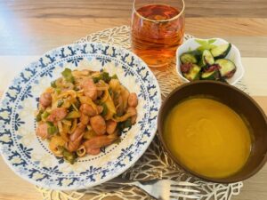 ナポリタン、バターナッツのスープ、きゅうりと梅の和え物、ルイボスティーです☺