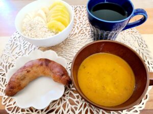 今日は、ドライトマトのパン、オーガニックのキャロットスープ、ヨーグルト(バナナ、キウイ、オートミール)、ルイボスティーです🍴✨