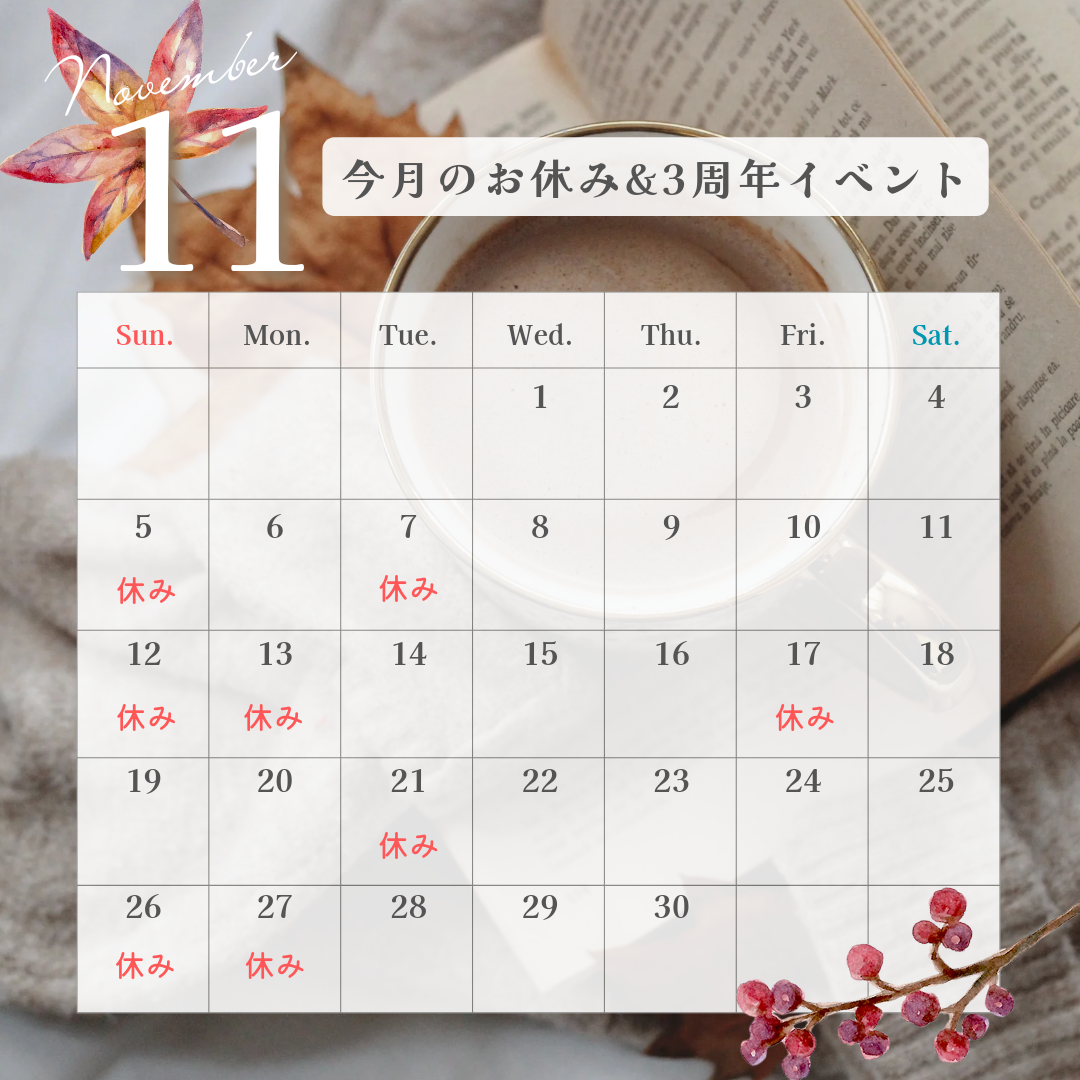 【11月のお休み&3周年イベント】 11月のお休みは画像を見て ご確認下さい😌✨️ 11月でお店が3周年となります💡 去年は交通事故に遭い…