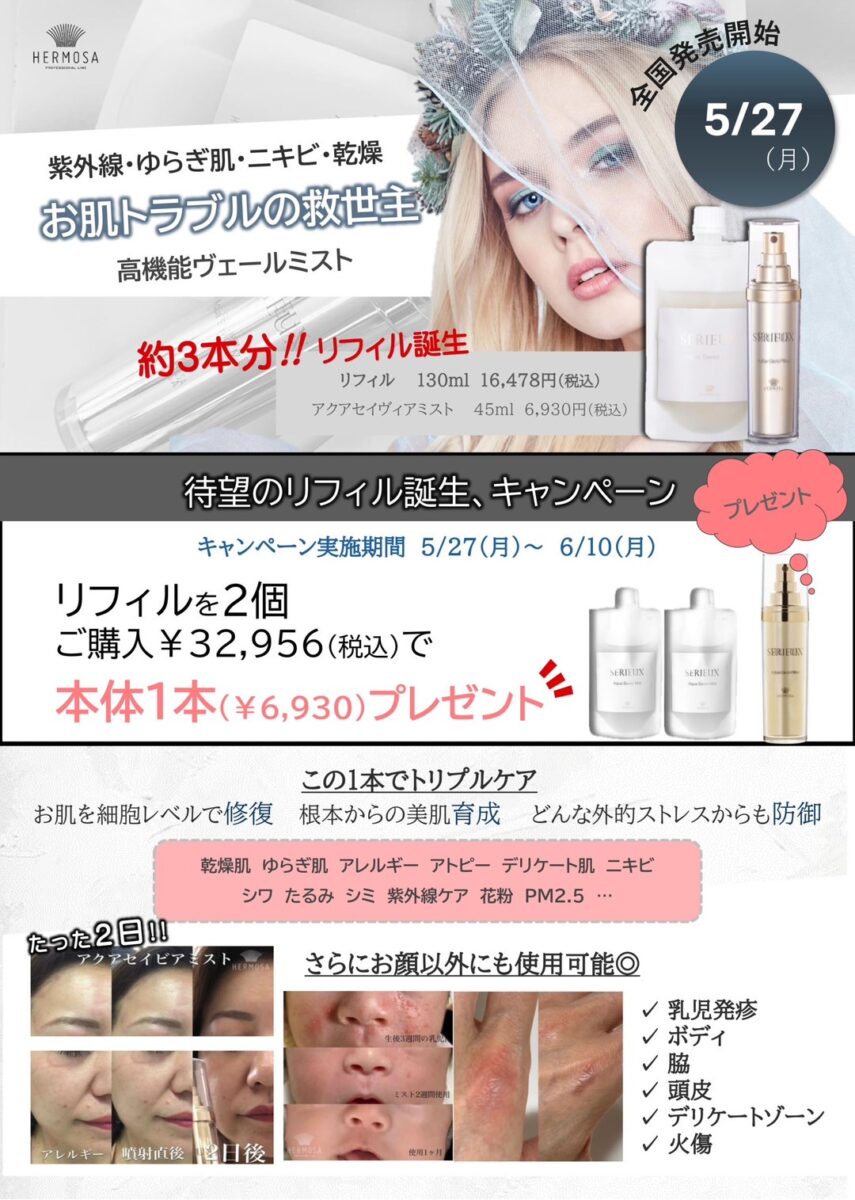 【アクアセイヴィアミストリフィル発売キャンペーン】 当店でも大人気のアクアセイヴィアミストの詰め替え用が 発売することとなりました💕 私も毎日愛用しているので詰め替え用は すごくありがたいで…