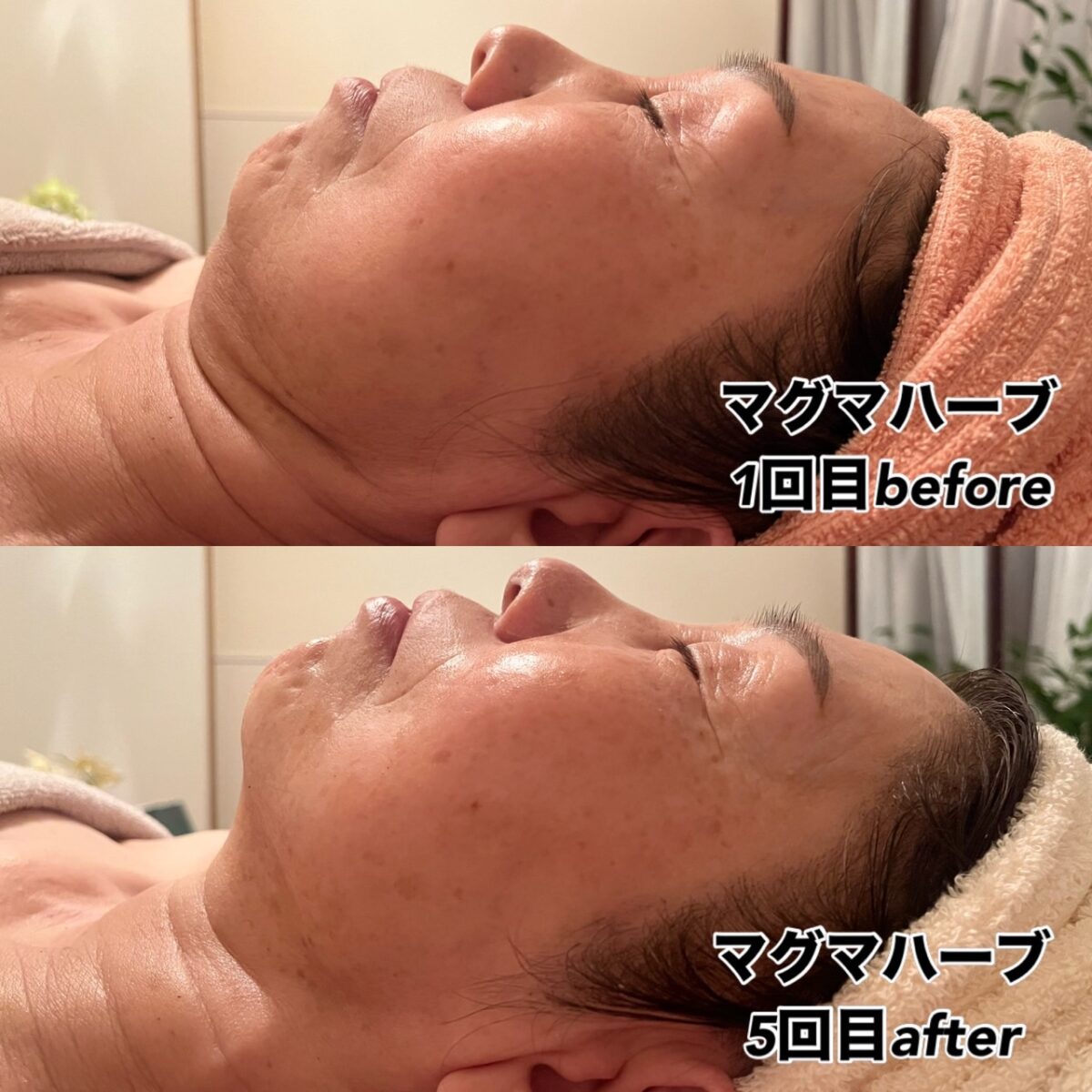 【マグマハーブ1回目before→5回目after】 マグマハーブ70分で首までハーブを入れ込んでいます✨️ またブラックハーブを使用しています💆✨…