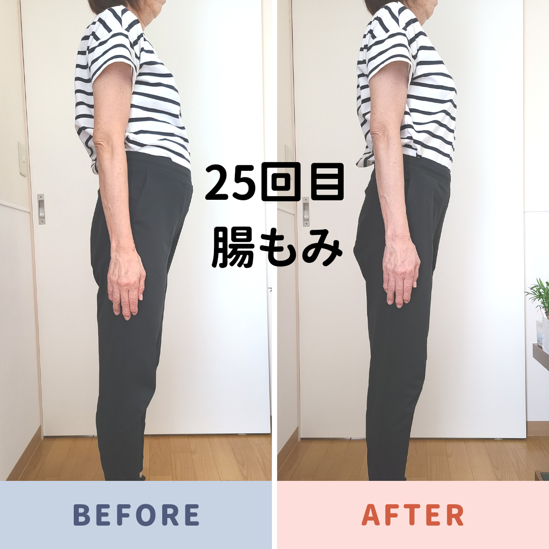 【腸もみ25回目 before→after】 《お客様のお悩み箇所》 ・食べた後、妊婦のようにお腹が出る ・バストが下がっている ・反り腰 ・脚が浮腫みやすく冷える 現在は、 内臓整体+腸もみ…